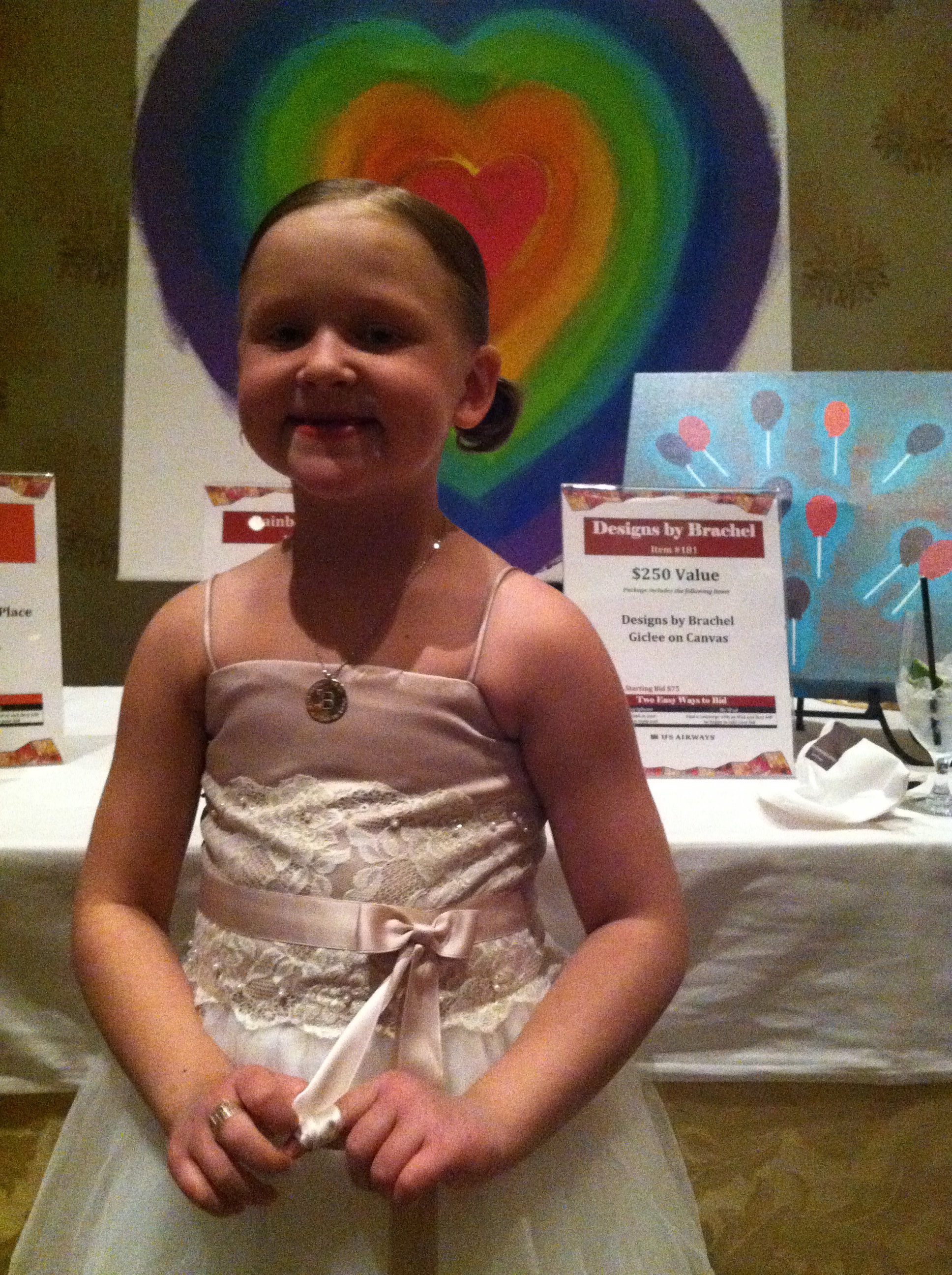 This past weekend Elizabeth, Brooke and myself were invited by the Phoenix Children’s Hospital to attend their annual Beach Ball Gala.  Of course we were super duper excited!  I had to explain to Elizabeth that we were going to get dressed up really super duper fancy and eat a super duper fancy dinner.  “Why?”  She asked.  “Well,” I said, “because it’s a way for the hospital to raise a lot of money for what they need to make children like you better.”  She agreed she would go, but still concerned about missing out on all the fun her brother and sister would be having at a friends house that night.  I agreed she could join them after the event and she was then fully on board with the idea.  I also told her that her artwork would be used in more ways than one that night to help raise that money.  Her eyes sparkled with joy.  And off she went to the Beach Ball Gala looking like Cinderella dressed in her fanciest, frilliest, cream and GOLD dress.