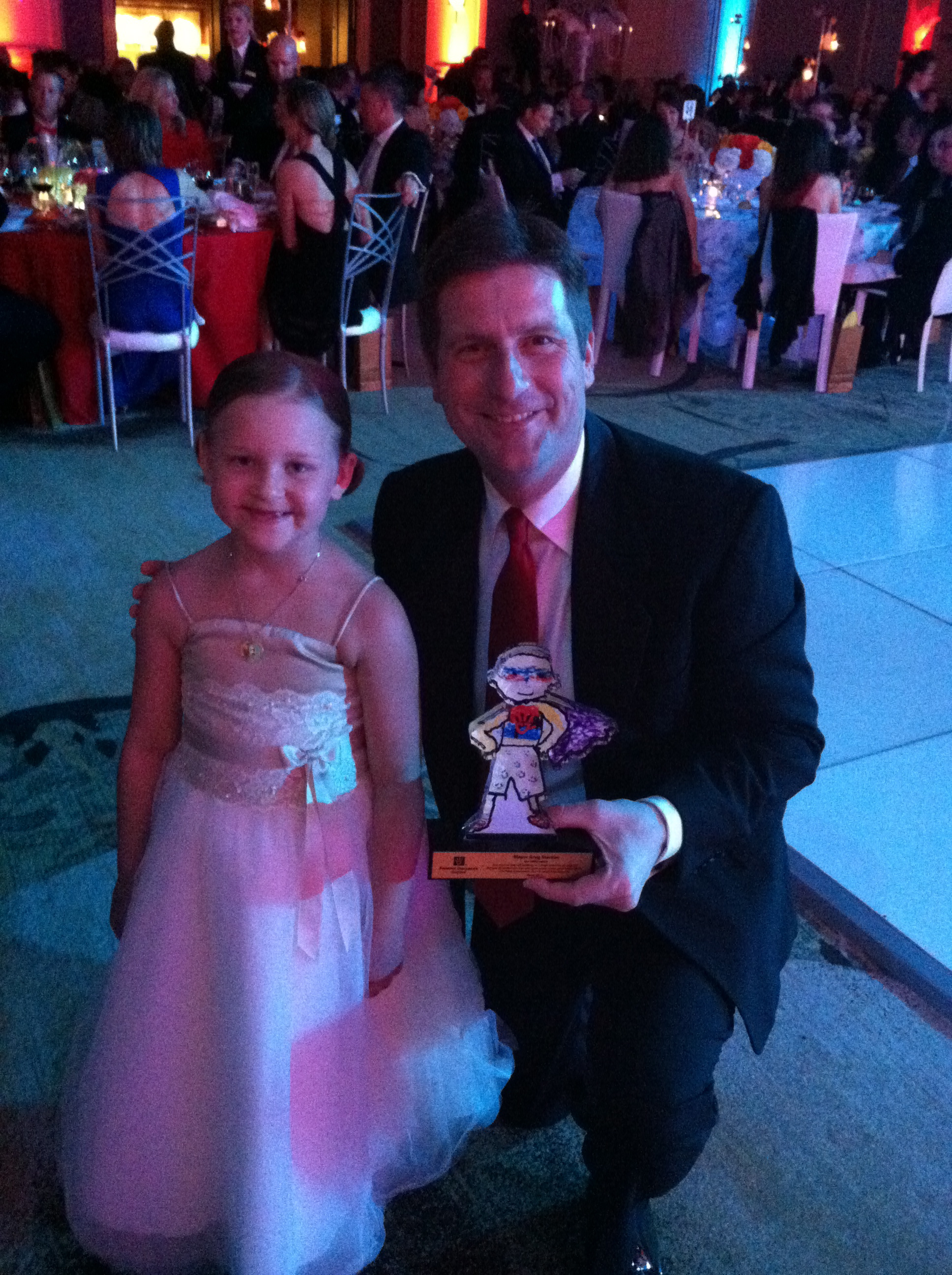 We were walking around looking at all the fanciness and visiting with all her amazing doctors when all of a sudden we spotted a rainbow heart painted by none other than EBB herself!  It was one of the many paintings she so passionately painted in the backyard to help kick cancer in the buttcrack.  People soon realized she was the artist of this beautiful work of art and began taking photos with her and shaking her hand.  She felt like an incredibly famous superstar!  At one point I said to Elizabeth, “Do you feel like the next Taylor Swift?”  Her response was, nope I feel like the first Elizabeth Brooklyn Blair.”  And just like that her painting at the young age of six raised a whopping $660.00 to help benefit the Heart Center at Phoenix Children’s Hospital!  Beauty truly does come from the heart!  After the silent auction, we grabbed a couple of Shirley Temples and were whisked away into the ballroom for a private preview of Phoenix Children’s Hospitals new Super Hero Award.  Artist of the award… you guessed it…Elizabeth Brooklyn Blair.  First super hero to be receiving this award…the Mayor of Phoenix, Greg Stanton!  After the award presentation, Elizabeth was asked if she would like to meet Mayor Stanton?  She had heard this might happen and had been practicing her greeting upon meeting him throughout the day.  She eventually decided on saying , “It’s nice to meet you Mr. Mayor.”  He was very kind and took a photo with her as well as the President and CEO of Phoenix Children’s Hospital, Bob Meyer.  I think we were introduced to a bunch of other important people, but it was all a dreamy blur at that point.