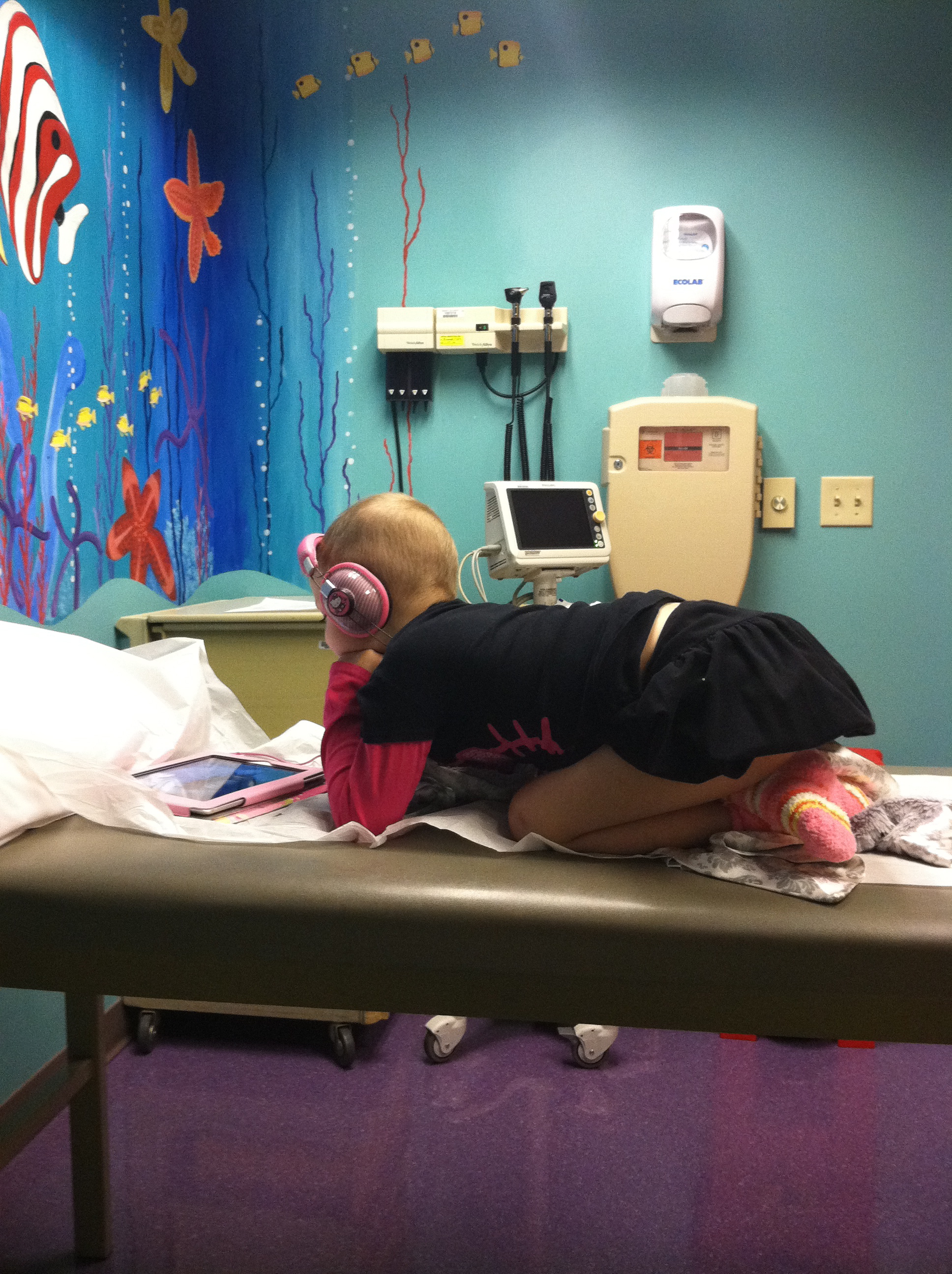 It all started a couple of weeks ago with a new lump, which we noticed that formed on Elizabeth’s head just above her original tumor. The doctor’s were not overly concerned, however, Brooke and I panic at even the thought of her cancer coming out of remission, especially before intense treatment is complete. It’s very unlikely for this to happen right now, however we were told it’s not impossible. I had not mentioned it on here, but deep inside Brooke and I have been really stressing about it. The doctors thought maybe from steroids, maybe skull resculpting or that it possibly felt like soft tissue? We had been keeping an eye on things and when she got off some of the chemo, we were scheduled for a CT Scan of the area in a couple of weeks to put everyone’s mind at ease. Well, as you know, yesterday was Monday, and we were at clinic for Elizabeth’s weekly chemotherapy. I must say it has been a very difficult week for Elizabeth. The toughest in a long time, actually. It has been anything but easy peasy lemon squeezy for her. Although her tummy aches constantly and sliding into first and feeling a sudden burst hit every now and then, she is really hanging in there. For weeks she has really been enjoying her food, however, eating is causing her lots of terrible pain these days. She was up most of last night and very uncomfortable for most of it. She does not feel much like getting out of bed or opening her eyes. She can not stand for longer than a couple of minutes. The doctors thought she looked very pale, and were shocked when her counts came back really good. After a very restless night, I called the clinic this morning and the next thing I know we are doing an emergency CT Scan of her abdomen. They decided to do the scan of her head as well, today!